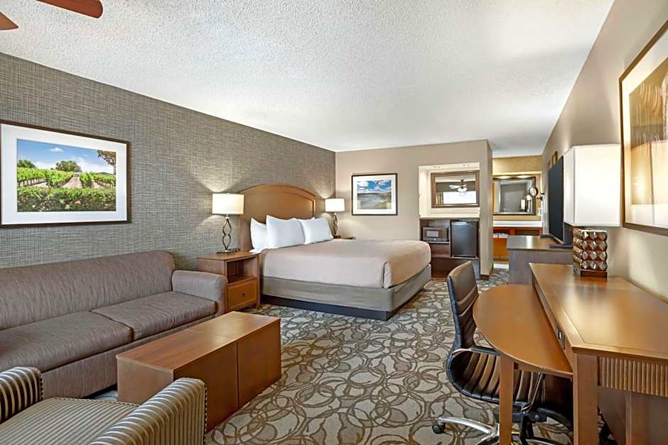 This spacious king room features a jetted tub and double sinks in the vanity area. An office desk with ergonomic chair is provided. Guests can enjoy the 50" SMART casting Philips television or lay back in the plush recliner. Other room amenities include a microwave, refrigerator, and coffeemaker.